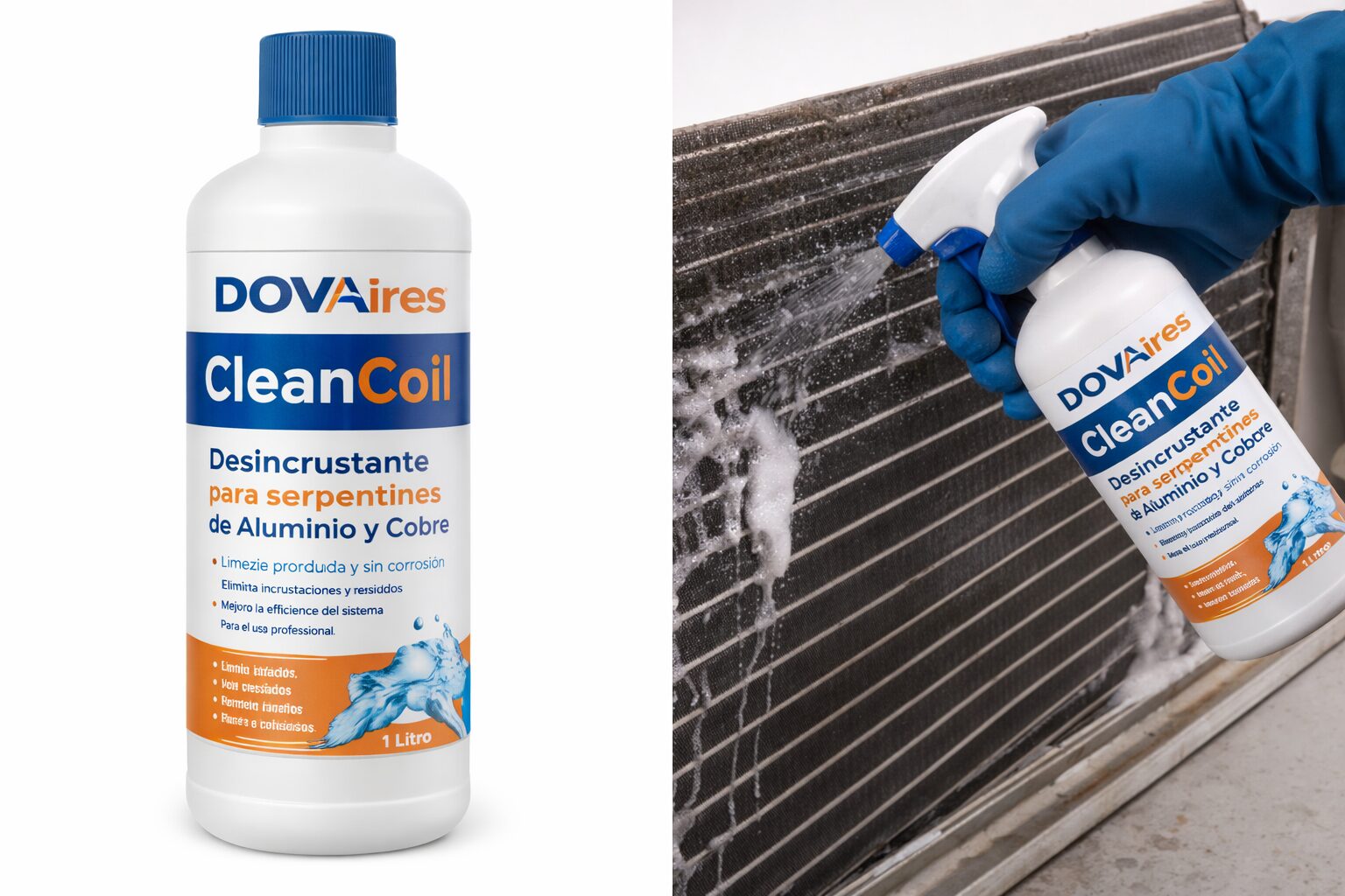 El desincrustante serpentines aire acondicionado DOVAires Clean Coil es una solución profesional formulada para la limpieza profunda de serpentines de aluminio y cobre, eliminando suciedad incrustada, grasa y residuos que afectan el rendimiento del sistema.